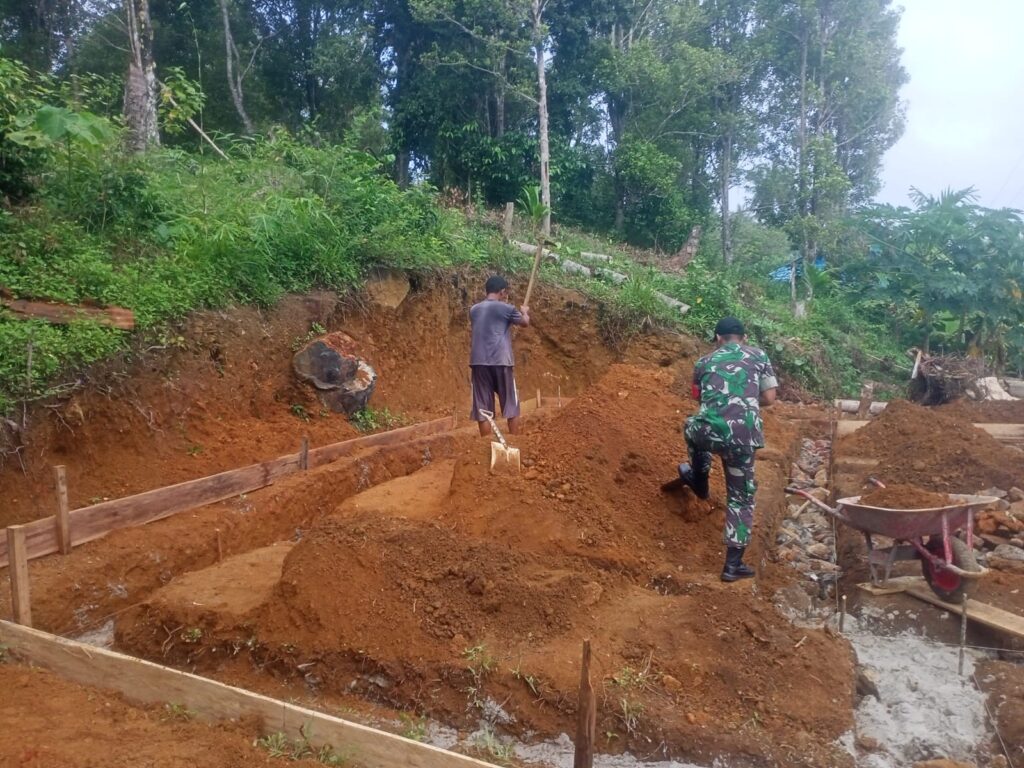Koptu Suwarno dengan penuh semangat membantu pembangunan rumah warga, meskipun saat ini masih proses pembuatan pondasi rumah.