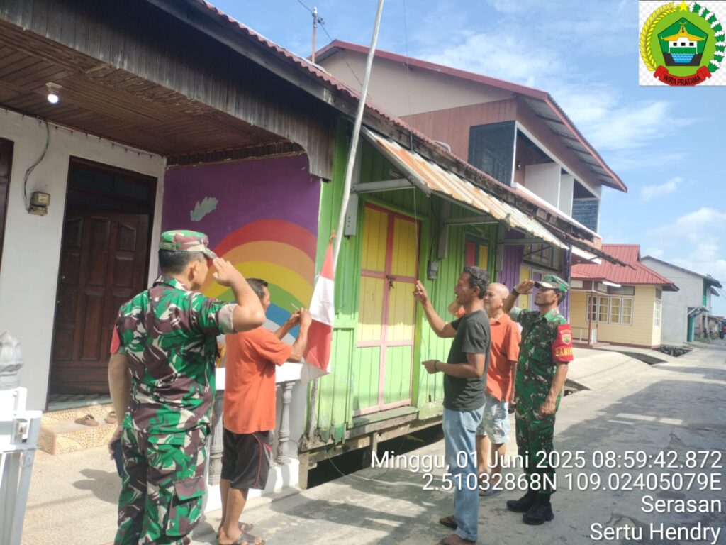 NATUNA – Babinsa Koramil 06/Serasan, Sertu Hendry bersama pemuda dan warga Kelurahan Pelimpak bersatu memperingati Hari Lahir Pancasila dengan memasang bendera merah putih di Kampung Pancasila. Minggu, (01/06).