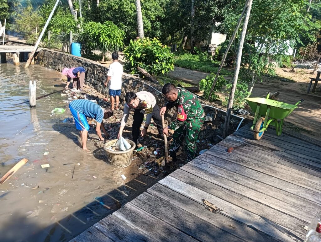 Tampak Babinsa dan warga bahu-membahu membersihkan pantai dari sampah plastik, dedaunan, dan sampah lainnya.