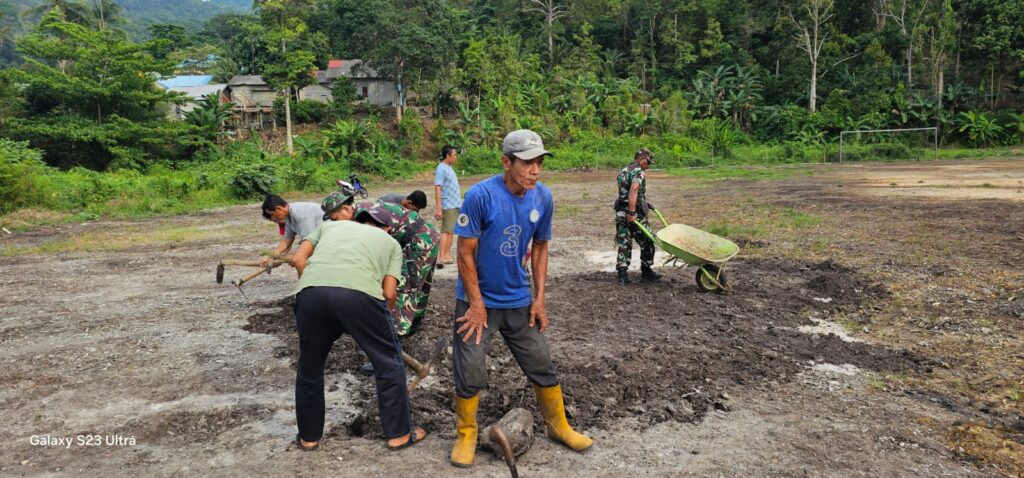 NATUNA – Danramil 06/Serasan, Kapten Inf Hasan Basri bersama sejumlah anggotanya dan warga melaksanakan Gotong Royong (Goro) membersihkan lapangan bola kaki Kecamatan Serasan Timur. Jum’at, (18/07).