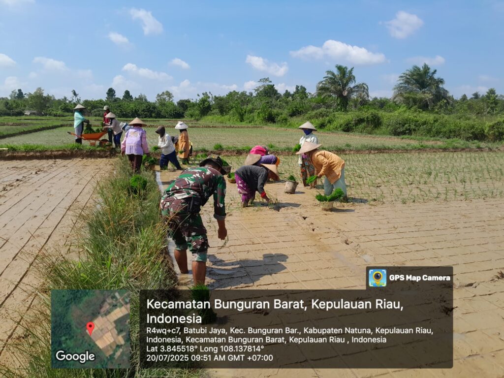 NATUNA – Babinsa Koramil 03/Sedanau, Kopda Yopi bersama kelompok tani Cipto Dadi Desa Batubi Jaya, Kecamatan Batubi melaksanakan penanaman padi. Minggu, (20/07).