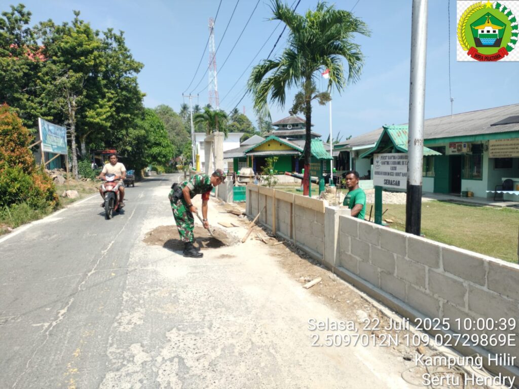 NATUNA – Babinsa koramil 06/Serasan, Sertu Hendry Purwanto melaksanakan kegiatan komsos membantu tukang dalam pengecoran pagar untuk Markas Koramil 06/Serasan. Selasa, (22/07).
