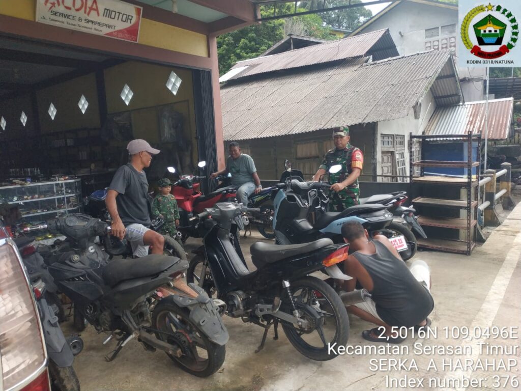 NATUNA – Babinsa (Bintara Pembina Desa) secara rutin menjalin komunikasi sosial (Komsos) dengan berbagai elemen masyarakat, termasuk para mekanik di bengkel.