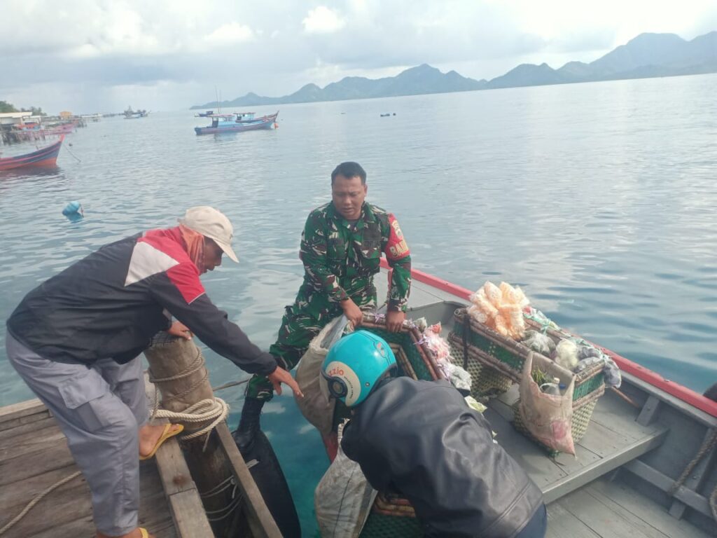 Seperti halnya yang dilakukan Babinsa Serda Eko Sidik membantu salah seorang warga binaan Desa Sabang Mawang Barat menurunkan keranjang sayur dari atas perahu. Selasa, (12/08).