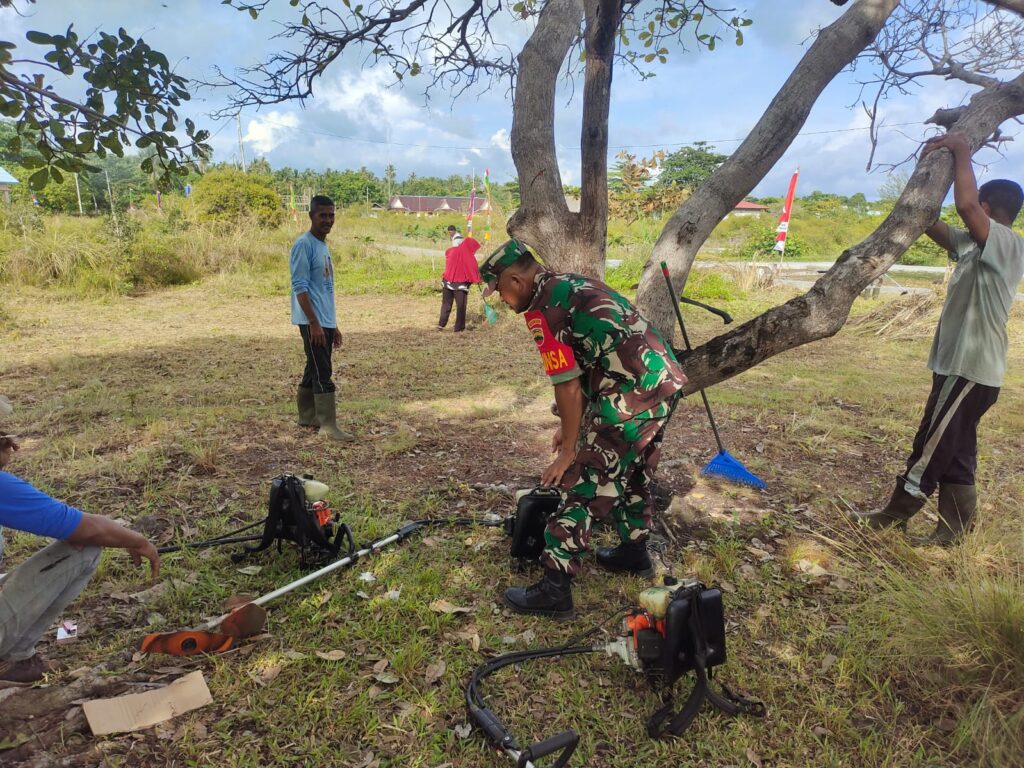 NATUNA – Babinsa koramil 06/Serasan, pos Ramil Subi, Serka Risdianto melaksanakan kegiatan Gotong Royong (Goro) bersama warga membersihkan lapangan upacara di Desa Terayak, Kecamatan Subi. Selasa, (12/08).