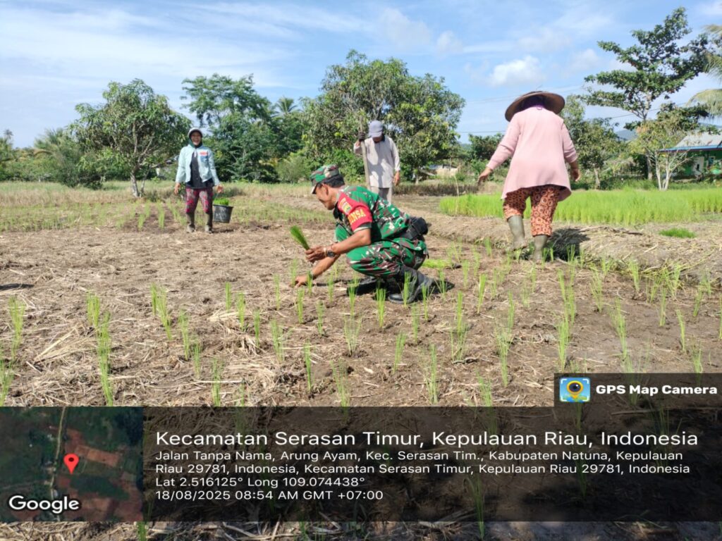 NATUNA – Babinsa Koramil 06/Serasan, Sertu Hendry Purwanto turut mendukung program ketahanan pangan dengan membantu para petani Desa Payak, Kecamatan Serasan Timur menam padi Tadah Hujan.