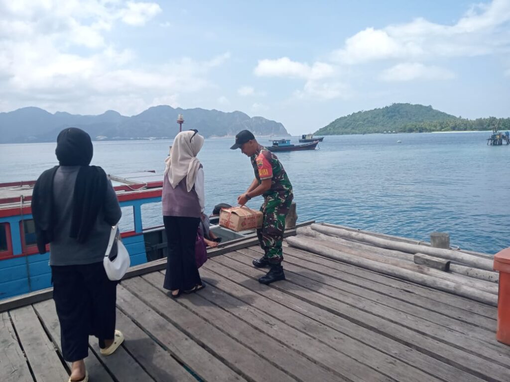 KUTIPAN – Babinsa Koramil 03/Sedanau, Serda Dadang Catur W turut membantu warga binaan yang akan menyeberang dari Desa Sabang Mawang menuju Pelabuhan Selat Lampa dengan menggunakan pompong. Minggu, (07/09).