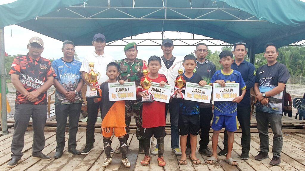 NATUNA – Babinsa Koramil 06/Serasan, Sertu Suwarno menghadiri penyerahan hadiah juara turnamen sepak bola anak-anak dalam rangka peringatan HUT RI Ke-78 Desa Air Ringau. Sabtu, (13/06).