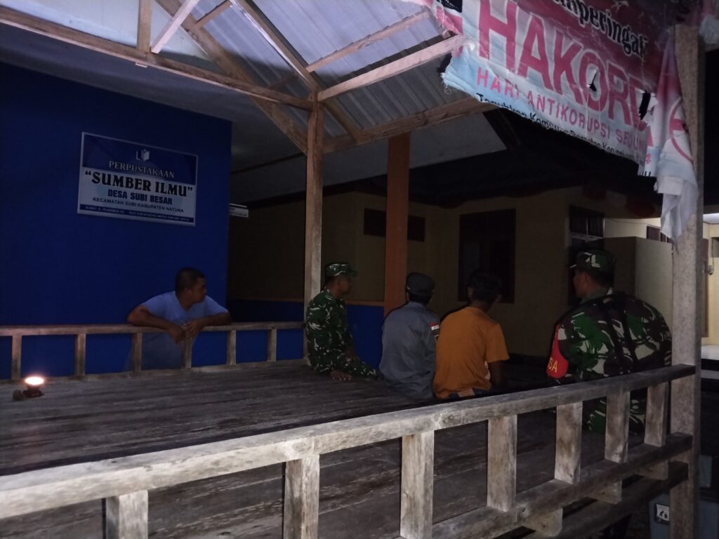NATUNA – Anggota Babinsa Koramil 06/Serasan, Serka Saroji bersama Masyarakat melaksanakan patroli malam hari sembari memberikan himbauan Kamtibmas kepada warga masyarakat