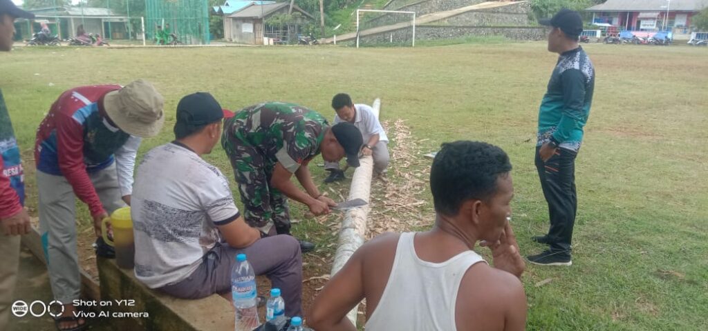 NATUNA – Babinsa Koramil 03/Sedanau, Koptu Suwarno turut Gotong Royong (Goro) bersama warga mendirikan pohon Pinang dalam rangka memeriahkan HUT Kabupaten Natuna Ke-26.