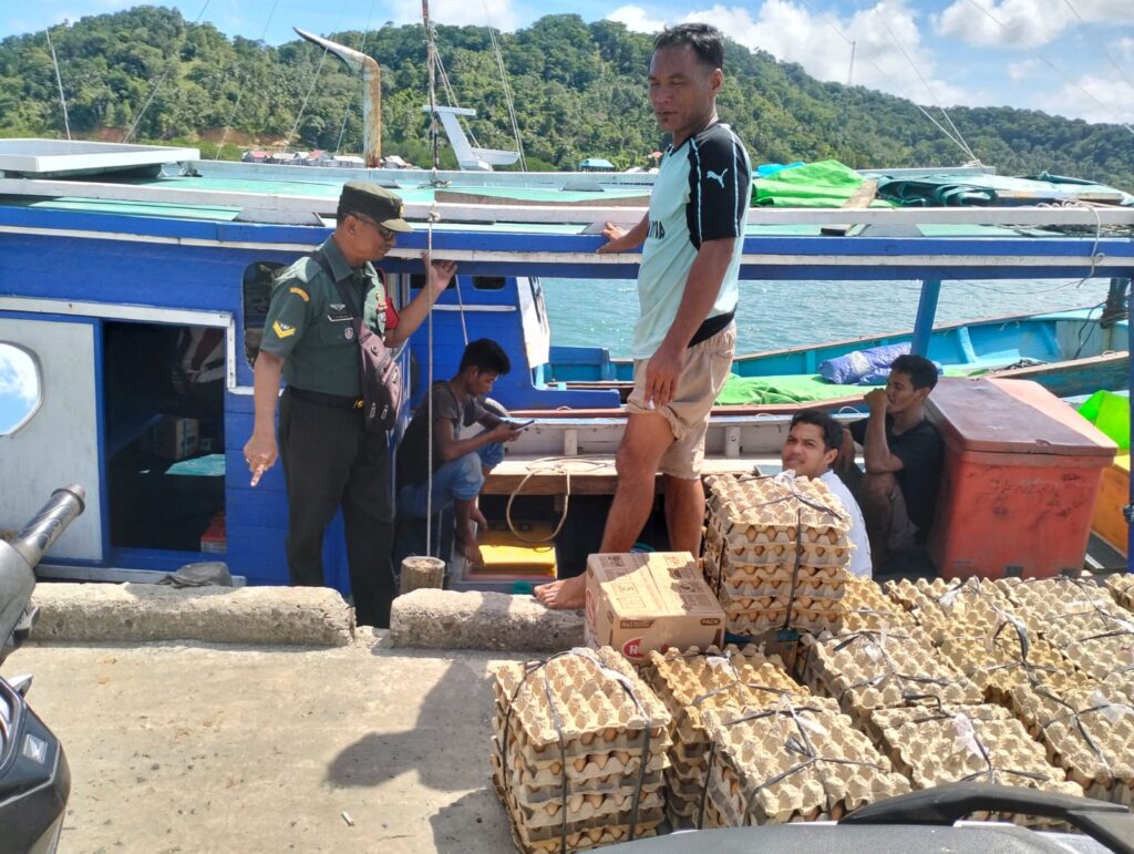 NATUNA – Babinsa Koramil 06/Serasan, Sertu Y.Chaniago turut membantu salah seorang warga binaan bongkar muat barang sembako di Pelabuhan pelantar Desa Arung Ayam, Kecamatan Serasan Timur. Kamis, (16/10).