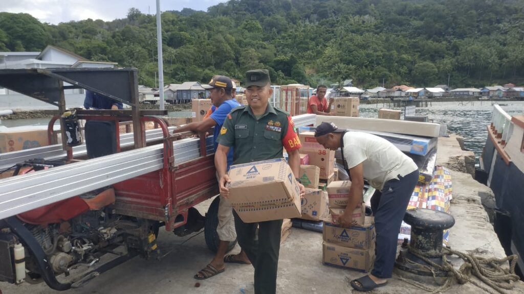 NATUNA – Babinsa Koramil 06/Serasan, Serka A. Harahap melaksanakan kegiatan komsos membantu masyarakat mengangkat barang yang baru datang dari pemangkat kalimantan barat dengan menggunakan kapal laut.