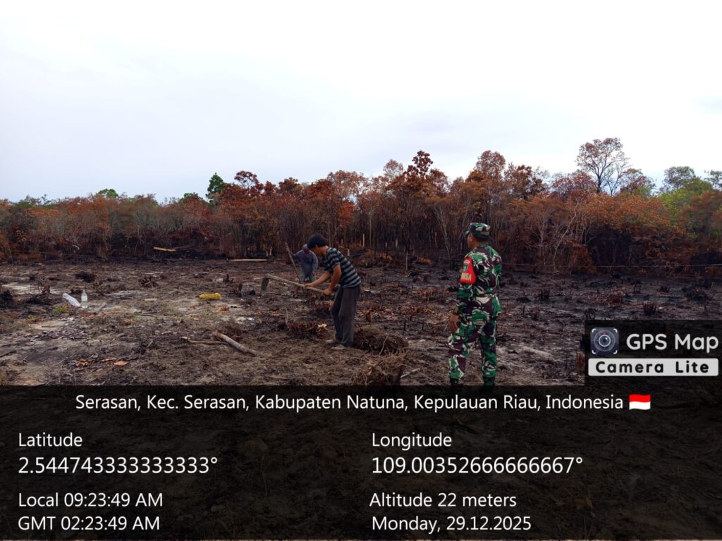 NATUNA – Babinsa Koramil 06/Serasan, Sertu Suwarno meninjau sekaligus membantu pekerja lahan Koperasi Desa Merah Putih KDMP desa Jermalik, Kecamatan Serasan. Senin, (29/12).