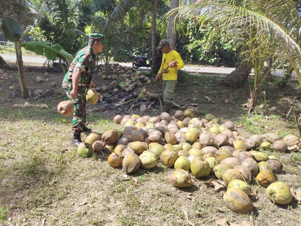 Kegiatan yang dimulai sekitar pukul 08.30 WIB tersebut dilakukan saat Serka Risdianto menyambangi Bapak Hermiadi yang tengah mengumpulkan hasil panen buah kelapa di kebunnya.