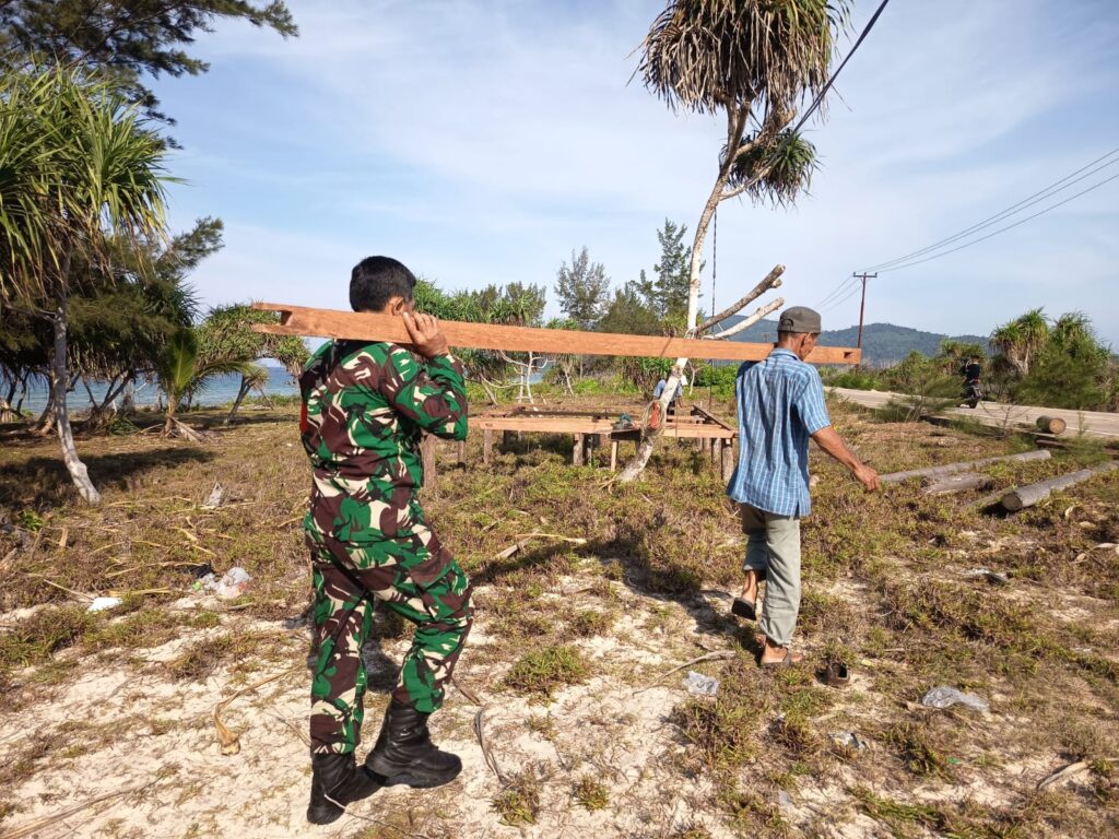 Natuna – Babinsa Koramil 06/Serasan, Serka A. Harahap, melaksanakan kegiatan komunikasi sosial (Komsos) dengan membantu masyarakat yang sedang membangun warung di kawasan Pantai Sisi, Desa Pangkalan, Kecamatan Serasan, Rabu (11/3/2026) sekitar pukul 08.30 WIB.