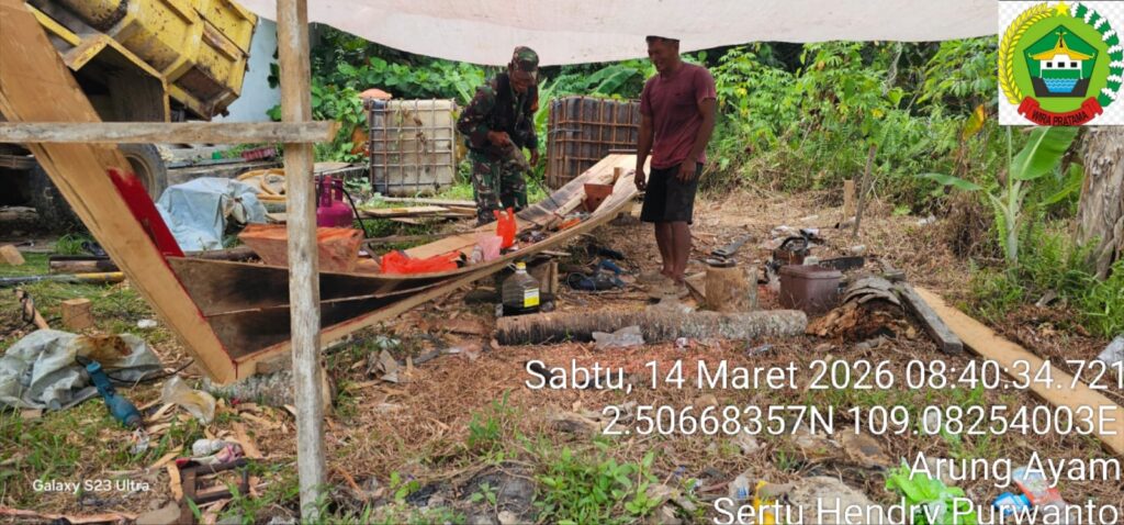 Natuna – Babinsa Koramil 06/Serasan Kodim 0318/Natuna, Sertu Hendry Purwanto melaksanakan kegiatan komunikasi sosial (komsos) sekaligus membantu warga binaannya yang berprofesi sebagai pembuat pompong di Desa Air Nusa, Kecamatan Serasan Timur, Kabupaten Natuna, Sabtu (14/3/2026) sekitar pukul 08.00 WIB.