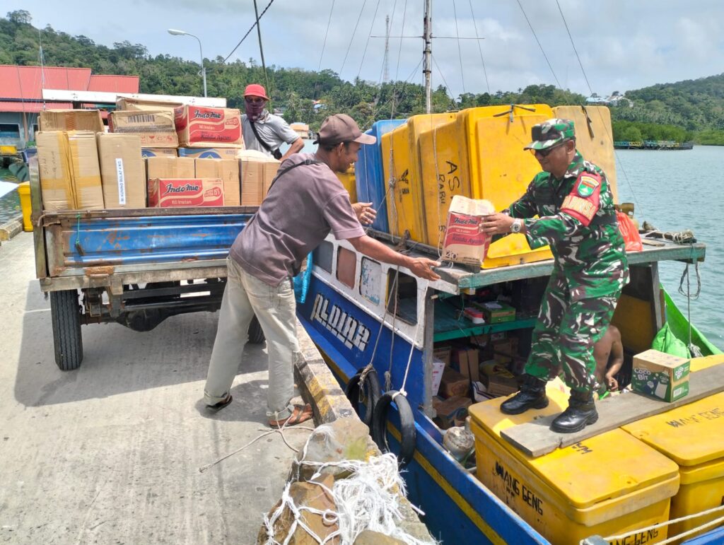 Natuna – Babinsa Koramil 06/Serasan Kodim 0318/Natuna, Sertu Y. Chaniago melaksanakan kegiatan komunikasi sosial (komsos) dengan membantu warga menurunkan barang kebutuhan pokok yang baru tiba dari Pemangkat di Kampung Air Peluntan, Desa Air Ringau, Kecamatan Serasan Timur, Kabupaten Natuna, Minggu (15/3/2026) sekitar pukul 09.40 WIB.
