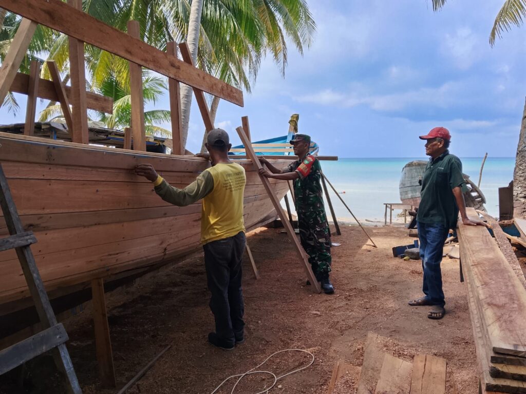 Personel Koramil 05/Midai Kodim 0318/Natuna, Serka Johan Syah, melaksanakan komsos bersama warga yang sedang membuat pompong (perahu tradisional) di wilayah Kelurahan Sabang Barat, Senin (30/3) pagi.