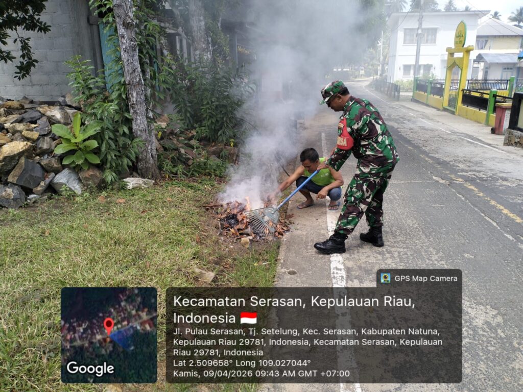 NATUNA – Wujud kepedulian terhadap kebersihan lingkungan sekaligus mempererat hubungan dengan masyarakat, Babinsa Koramil 06/Serasan Kodim 0318/Natuna, Sertu Y. Chaniago melaksanakan kegiatan komunikasi sosial (komsos) bersama warga binaannya di Desa Tanjung Setelung, Kecamatan Serasan, Kamis (9/4/2026).