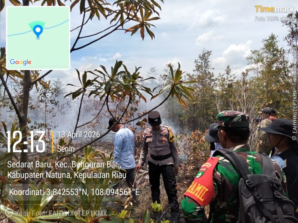 Natuna – Unsur Forum Koordinasi Pimpinan Kecamatan (Forkopincam) Bunguran Barat bersama personel Pos Pengamanan (Pospam) Karhutla Batubi melaksanakan monitoring perkembangan titik hotspot di wilayah Kampung Seminteh, Kelurahan Sedanau, Kecamatan Bunguran Barat, Senin (13/4/2026).