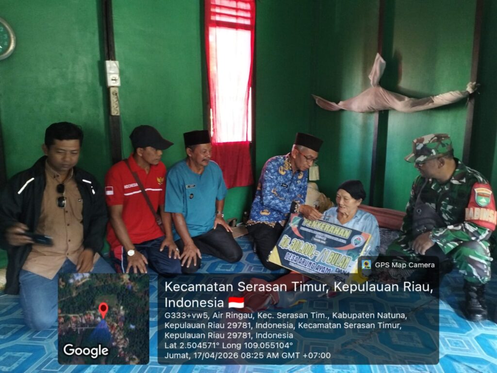 NATUNA – Babinsa Koramil 06/Serasan Kodim 0318/Natuna, Sertu Y. Chaniago, melaksanakan pendampingan penyaluran Bantuan Langsung Tunai Dana Desa (BLT DD) Tahun 2026 di Desa Arung Ayam, Kecamatan Serasan Timur, Jumat (17/4).