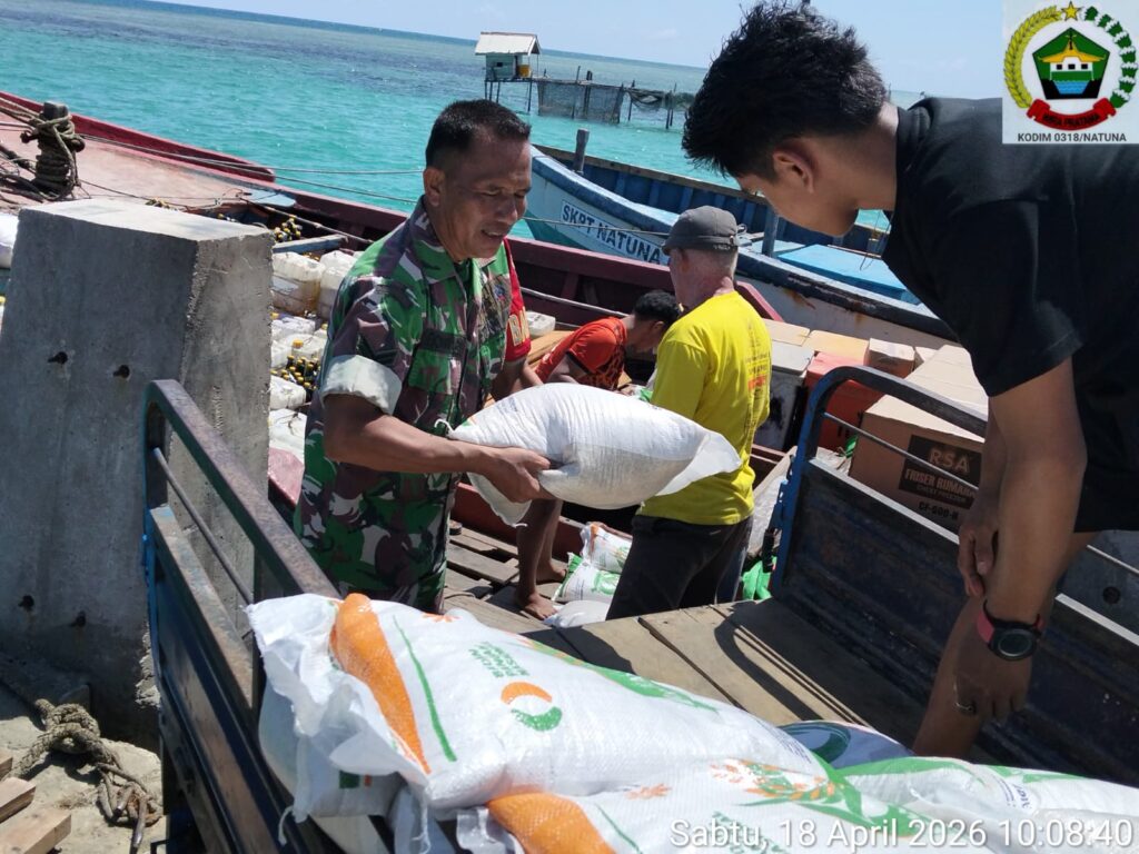 NATUNA – Babinsa Desa Batu Belanak, Koramil 05/Midai Kodim 0318/Natuna, Sertu Bonar Ritonga melaksanakan kegiatan komunikasi sosial (komsos) sekaligus membantu warga dalam aktivitas bongkar muat barang di pelabuhan Desa Batu Belanak, Kecamatan Suak Midai, Sabtu (18/4).